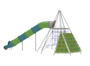 The main play zone is designed for older children seeking challenge, movement, and exploration. At its center stands the Masada model, a robust steel structure made up of seven star-shaped towers connected by a network of bridges and crawl tunnels. An additional bridge leads to the Oz rope climbing pyramid, extending the adventure even further. The area also includes the Mars rope climbing pyramid, climbing cubes, swings, and carousels—creating a rich, high-energy environment that encourages strength, coordination, and confident exploration.