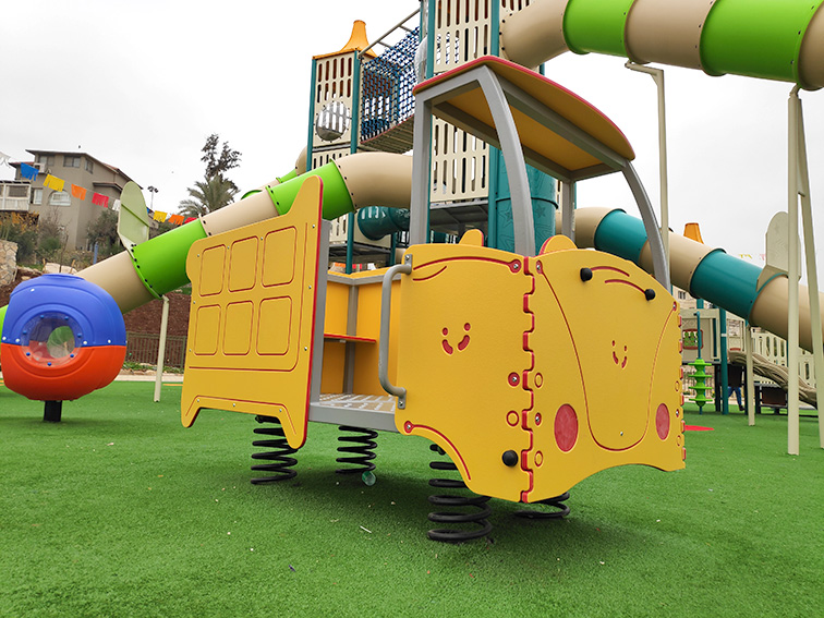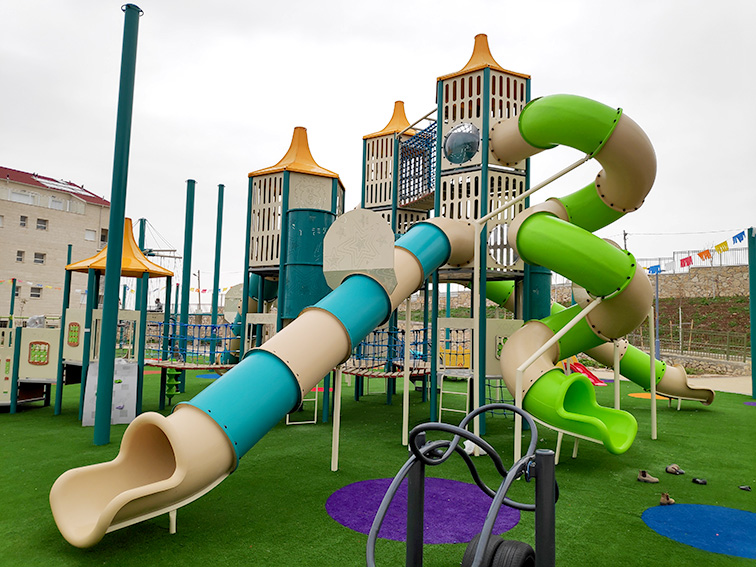 This impressive playground was designed to create a world of adventure where children of all ages can explore, challenge themselves, and let their imaginations run free. At the heart of the project stands the magnificent “Metzada” castle—a large, multi-level play structure featuring seven interconnected towers. Each tower is linked by bridges, climbing routes, and slides, forming a continuous journey of movement, excitement, and discovery. The design thoughtfully incorporates a wheelchair-accessible ramp, ensuring that children of all abilities can enjoy the full experience and feel part of the fun.