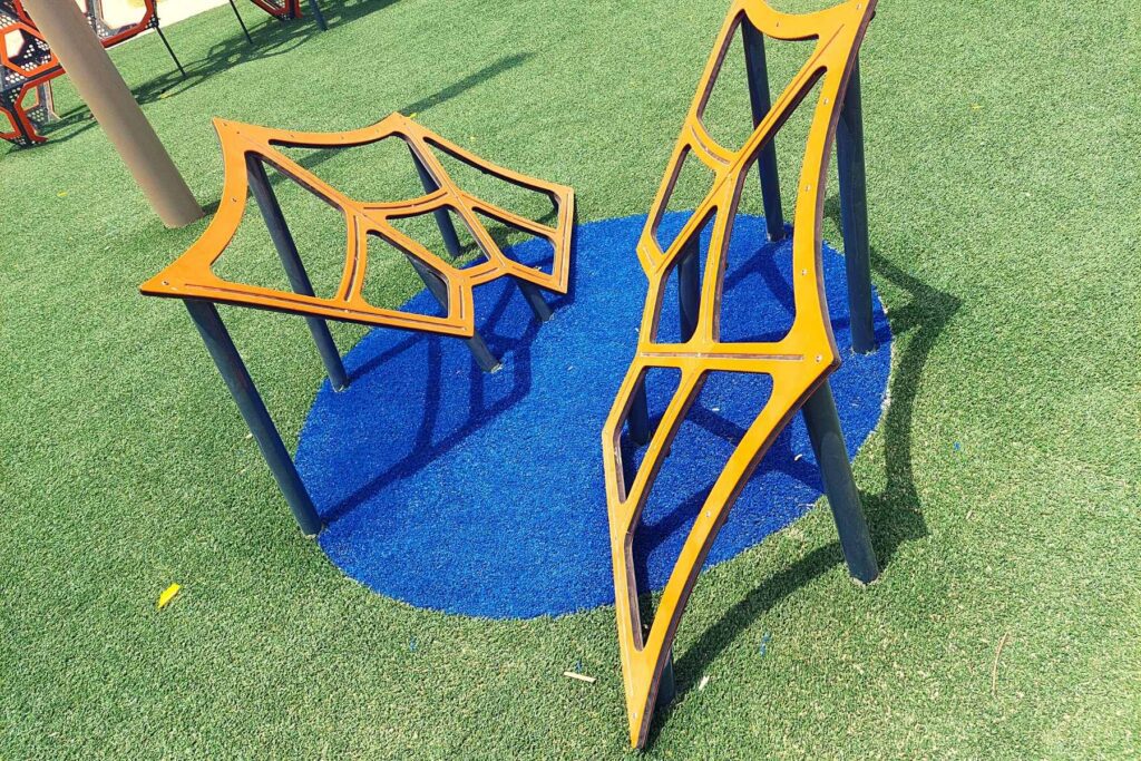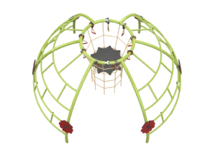 Beyond climbing, the playground integrates musical instruments, movement-based play, and interactive electronic elements. The Pomelit drum carousel offers a thrilling spinning experience that strengthens balance and coordination, while the Spider Webs climbing net provides a low-level challenge ideal for ninja training and agility practice. Outdoor musical instruments add harmony and rhythm to the space, giving children a way to express creativity through sound. To complete the experience, the playground includes three electronic play units: a Leaf & Rose Swing that lights up and plays music with every motion, a music ball operated by a crank, and an energetic DJ station where kids can mix tracks with buttons and spinning controls. These elements create a playground that feels modern, exciting, and full of sensory discovery—perfect for communities seeking a fun, future-ready play environment.