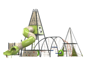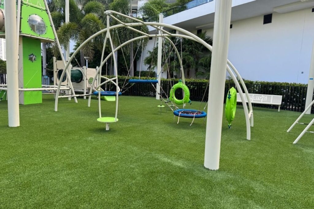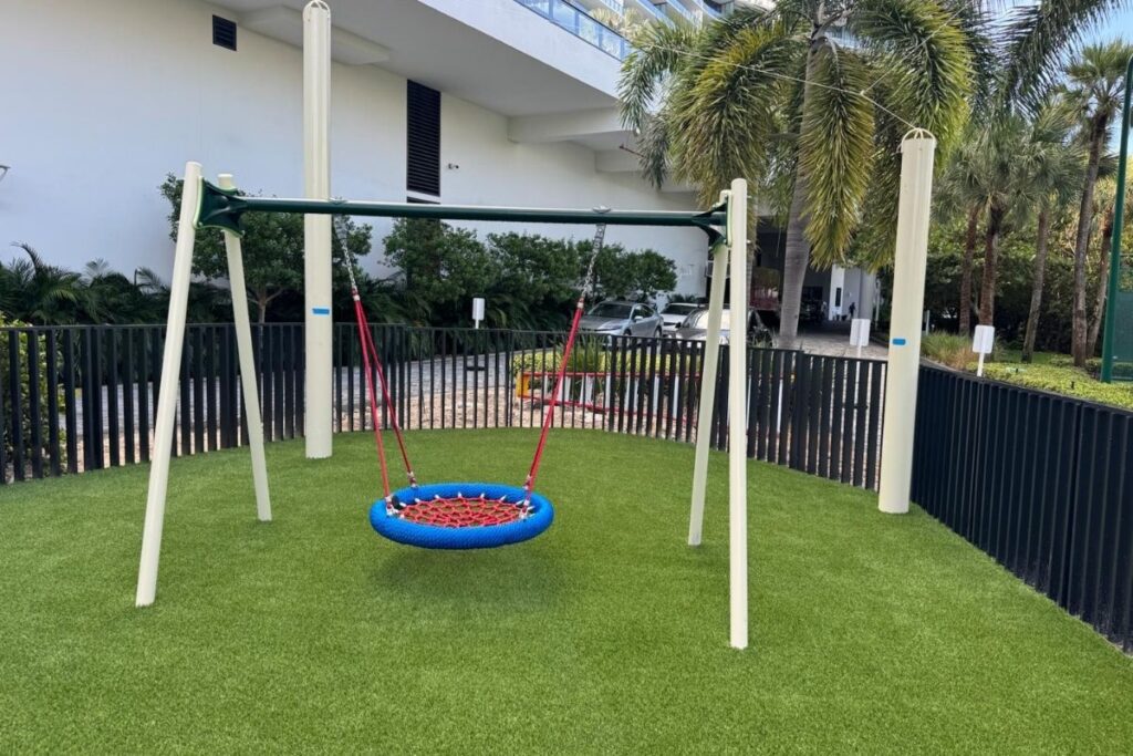 The final design includes the Detroit Extreme Play System, a bird’s nest swing, two benches, and custom shading structures, all harmoniously integrated within the landscape of this luxurious island.