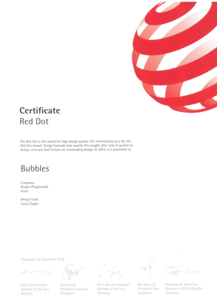 Bubbles” is a Red Dot Design Award–winning playground inspired by soap bubbles, offering an innovative and interactive play experience. Its steel towers, hanging bridges, rope nets, and spiral slides provide safe yet challenging play with panoramic views for all ages. The award highlights the structure’s international recognition for creativity, quality, and engaging physical play.