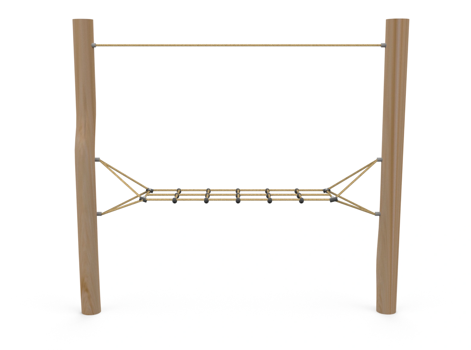 The Astoria-Megler Bridge A structure is made from European Robinia wood and is part of the Big Four Bridge challenging ropes course. It consists of two stable wooden posts with a rope net stretched between them. It is designed for balance challenges and stable movement using hands and feet, while improving coordination and strength. This structure can stand independently, providing a unique and challenging climbing experience for children and youth.