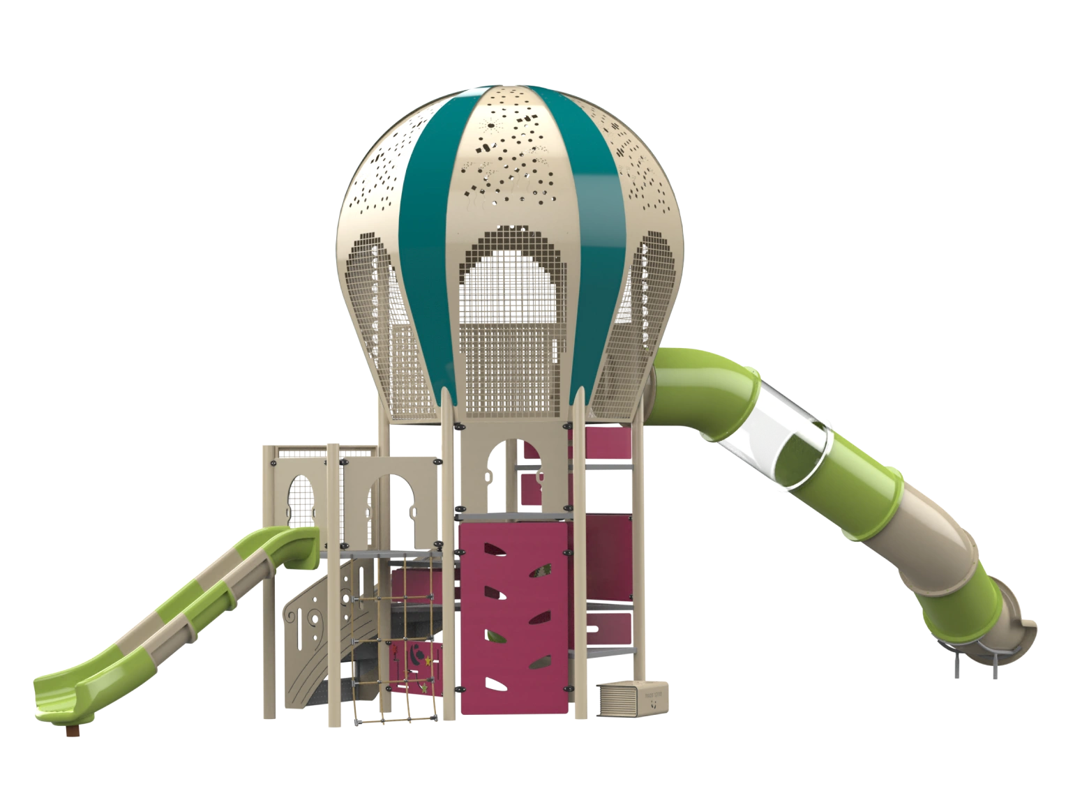 The Balloons 1 is designed as a magical hot air balloon. Its base is a multi level play system with 6 levels and includes a tube slide, a straight slide and a toddler slide, a climbing wall, a rope ladder for climbing, accessible stairs, a balcony, and 2 play panels. At the top of the structure is a giant hot air balloon dome. The play system is suitable for imagination and journey games and for physical activities such as climbing, movement, and sliding. It develops curiosity and creativity through the special design experience, and spatial perception, orientation, and motor control through the rich internal designs.