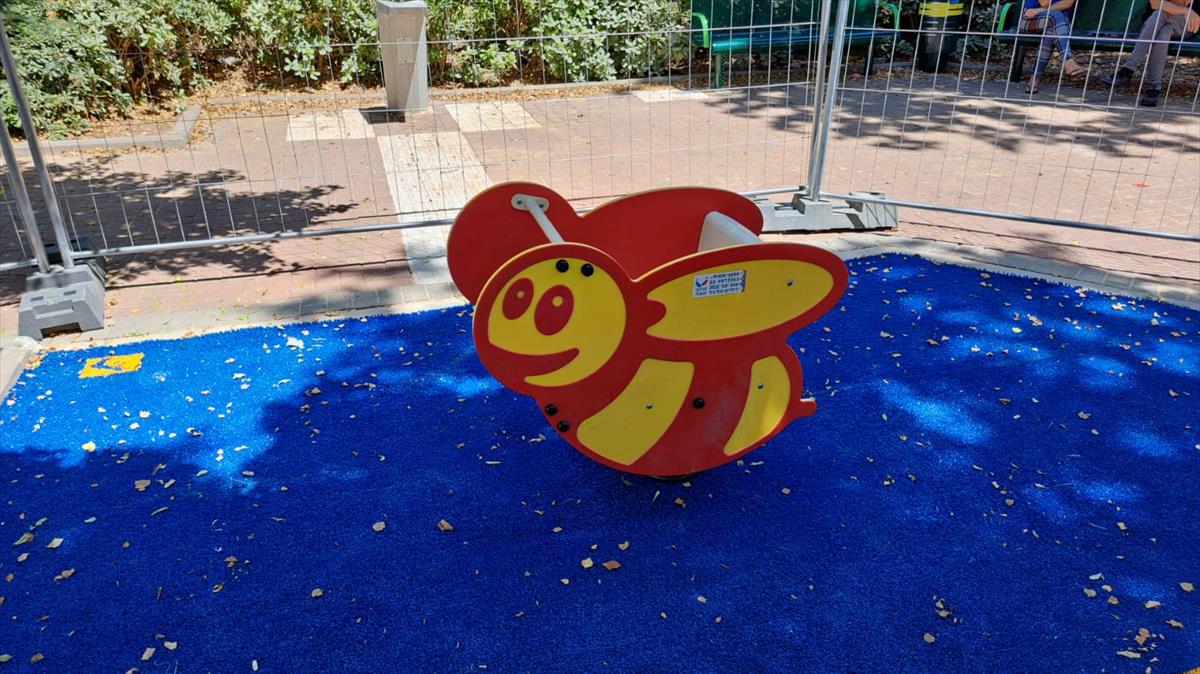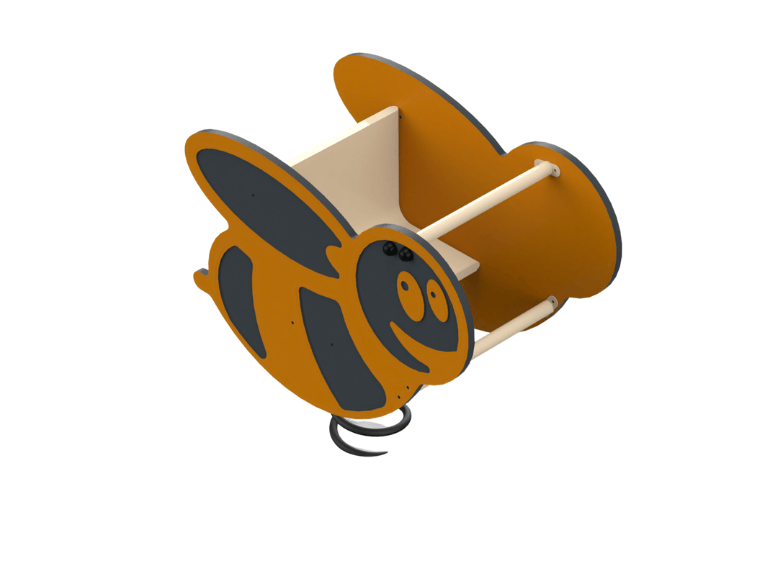 Bee-shaped bench for one. The bee figure is made of galvanized, rolled, and painted metal with HDPE siding. The rocking experience that the spring allows is beloved by young children due to the rhythmic and cyclical movement, and many children integrate role-play into the rocking.