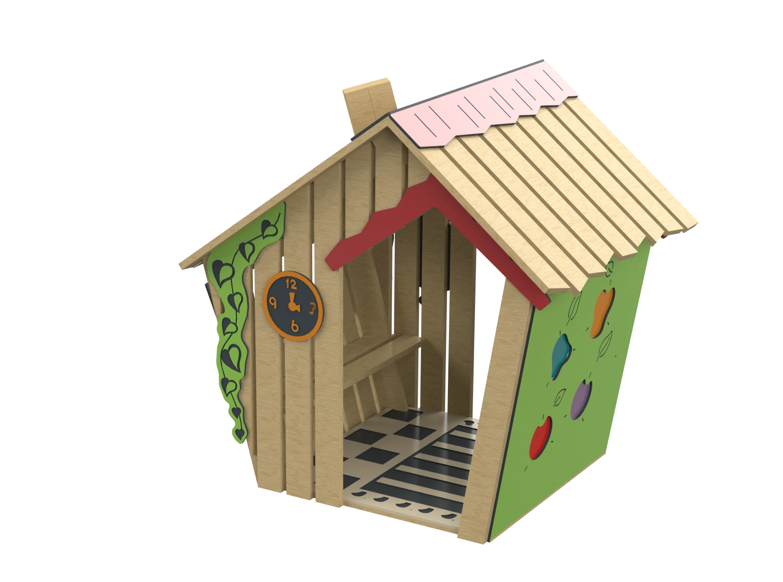 The Jungle House invites children into a charming cabin made from natural Robinia Wood, featuring colorful HPL panels. Inside the cabin, there is an engraved activity board to stimulate imagination and a xylophone for musical play. A comfortable bench allows children to enjoy moments of rest and cooperation. The design encourages exploration and free play, providing a space where children can nurture their creativity and imagination in a safe and enjoyable environment.