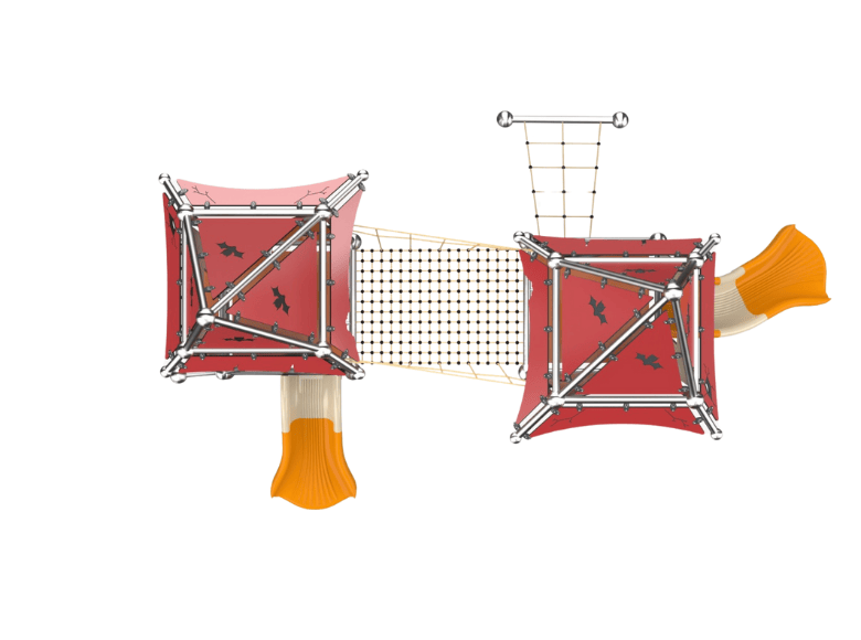 The Lil Witch House 2A is a unique playground equipment designed in international Sloppy style design, where the structures break conventions with a disheveled, seemingly crooked and broken appearance, emphasizing elements from the world of fairy tales and witchcraft. The structure consists of two cabins connected by a challenging cable bridge, where children can move freely between the cabins. Climbing to each cabin is done via a strong cable net, and descent back is possible through HDPE slides specially designed for young children.