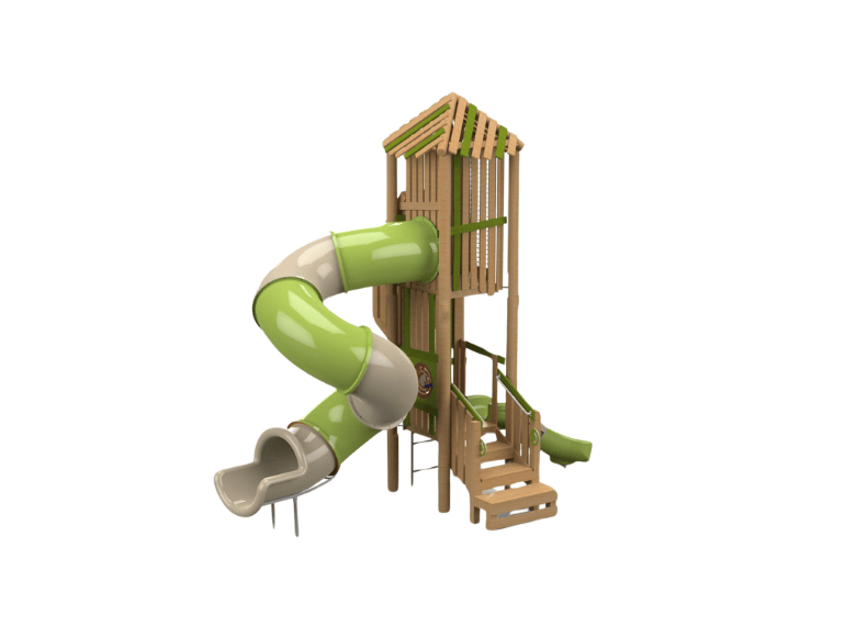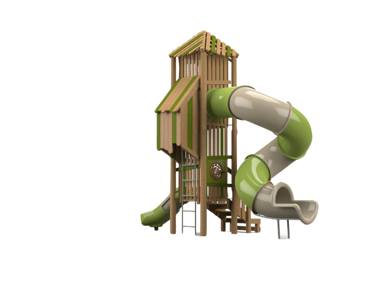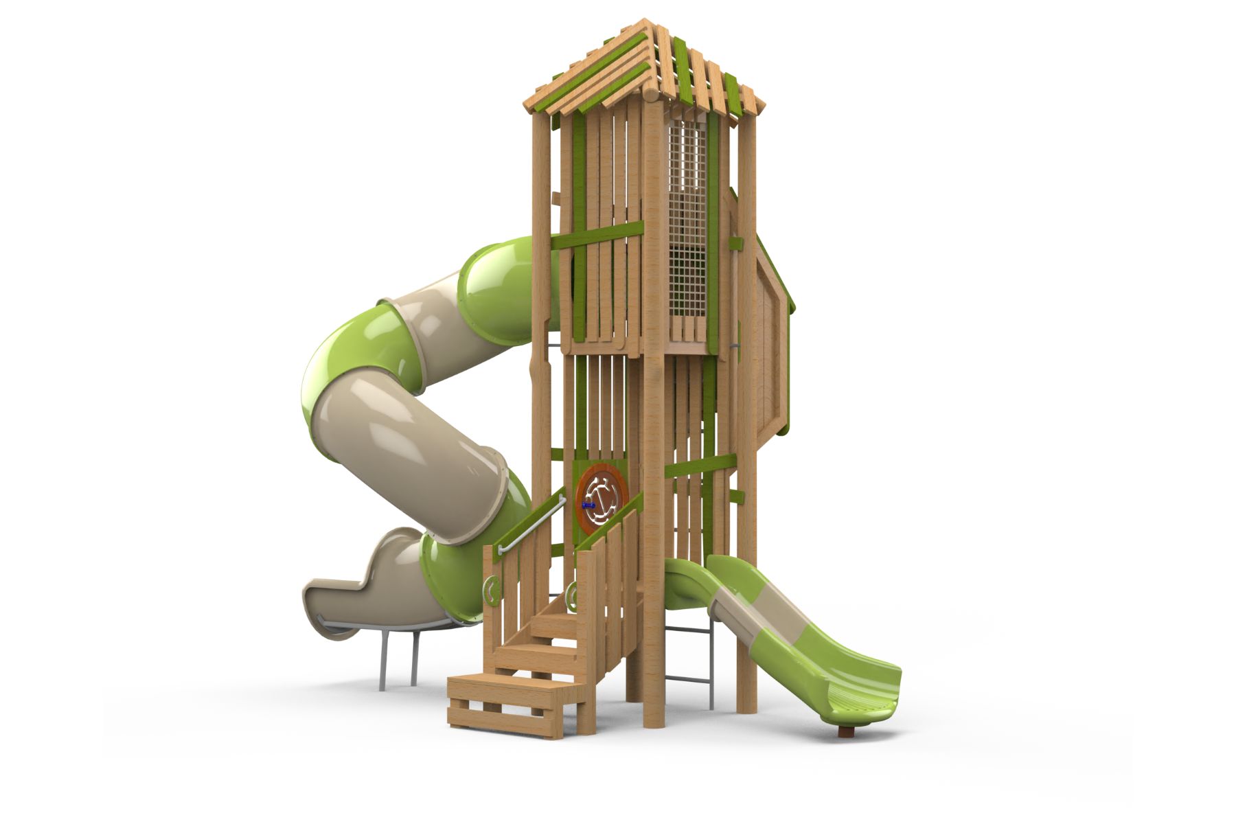 The Lorenzo B play system model is made from Robinia Wood and features a tall tower with a spiral slide and an additional slide for toddlers. This equipment is suitable for children of various ages, offering a fun and challenging play experience with climbing, playing, and sliding elements. The natural Robinia Wood design integrates beautifully into green surroundings, providing children with a sense of adventure while developing motor skills, balance, and coordination.