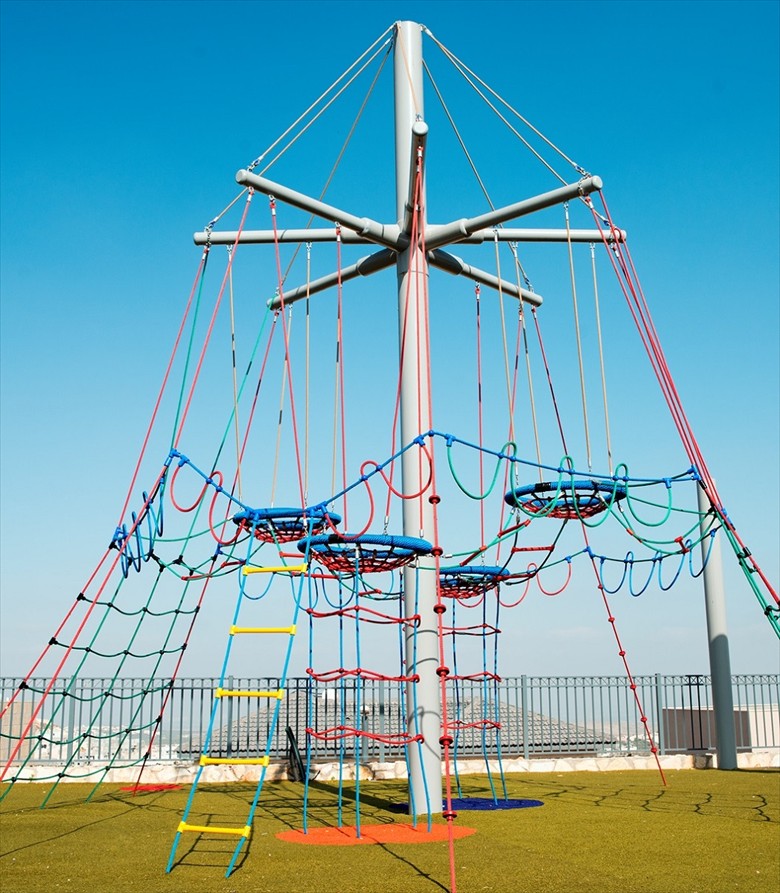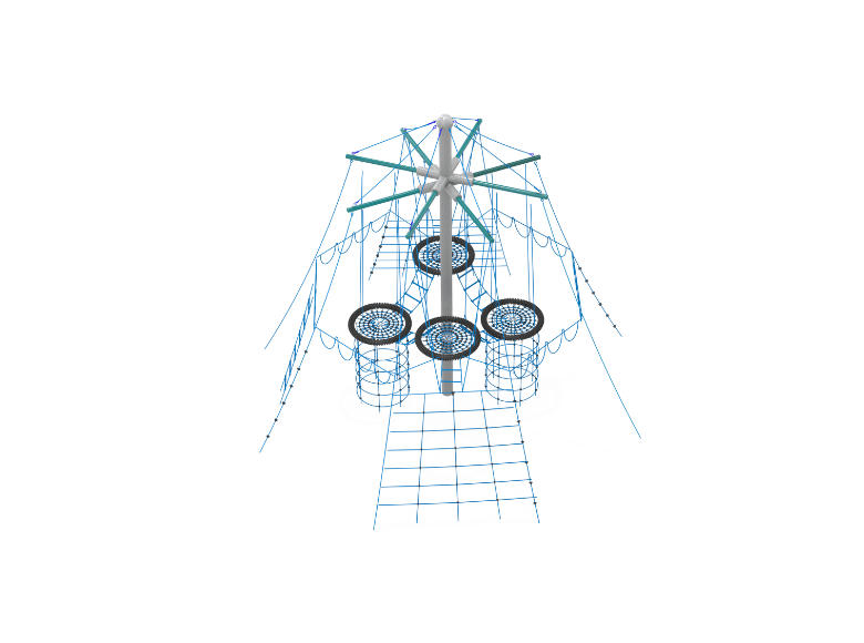 The Mars is a challenging pyramid-shaped climbing structure standing at 6.5 meters tall. The structure includes ropes and ladders with hand and foot holds. At its center, 4 cable discs with a diameter of 1.22 m are attached. Suitable for games that develop imagination, physical development, and social intelligence. Encourages curiosity and exploration, independence, spatial orientation, stage planning, and proper organization.