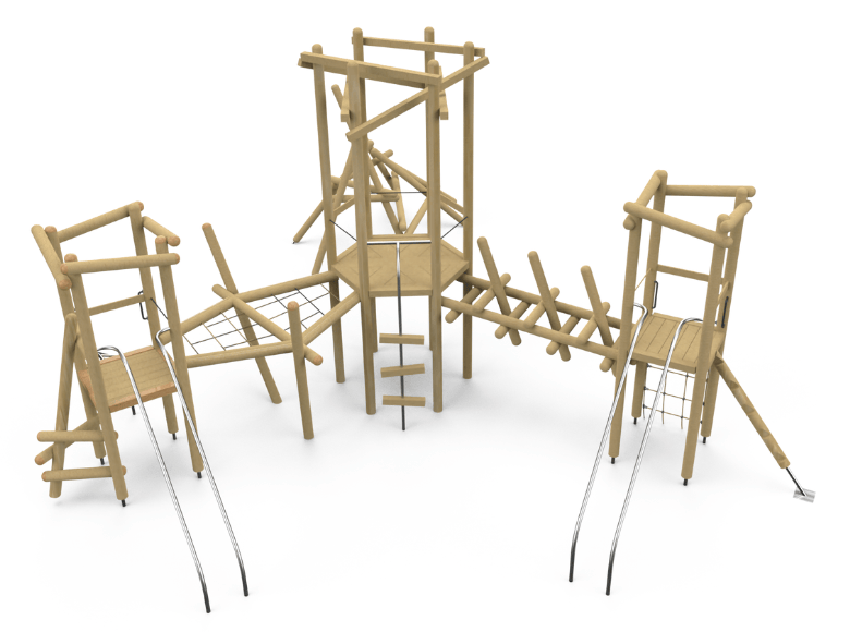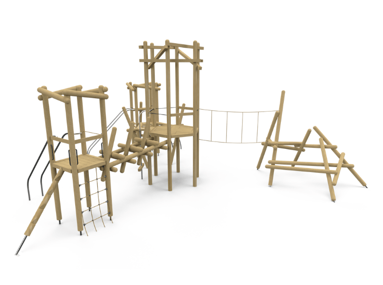 The Merlin B model offers a challenging play experience combining climbing, walking on ropes and bridges, and sliding. The system is made from natural European Robinia Wood and includes rope nets for climbing and walking, various climbing ladders, and a challenging Robinia bridge. The stainless steel slides and curved ladders add various levels of difficulty, suitable for children seeking a physical adventure filled with challenges. The system is ideal for developing balance, strength, and coordination while engaging in fun play.