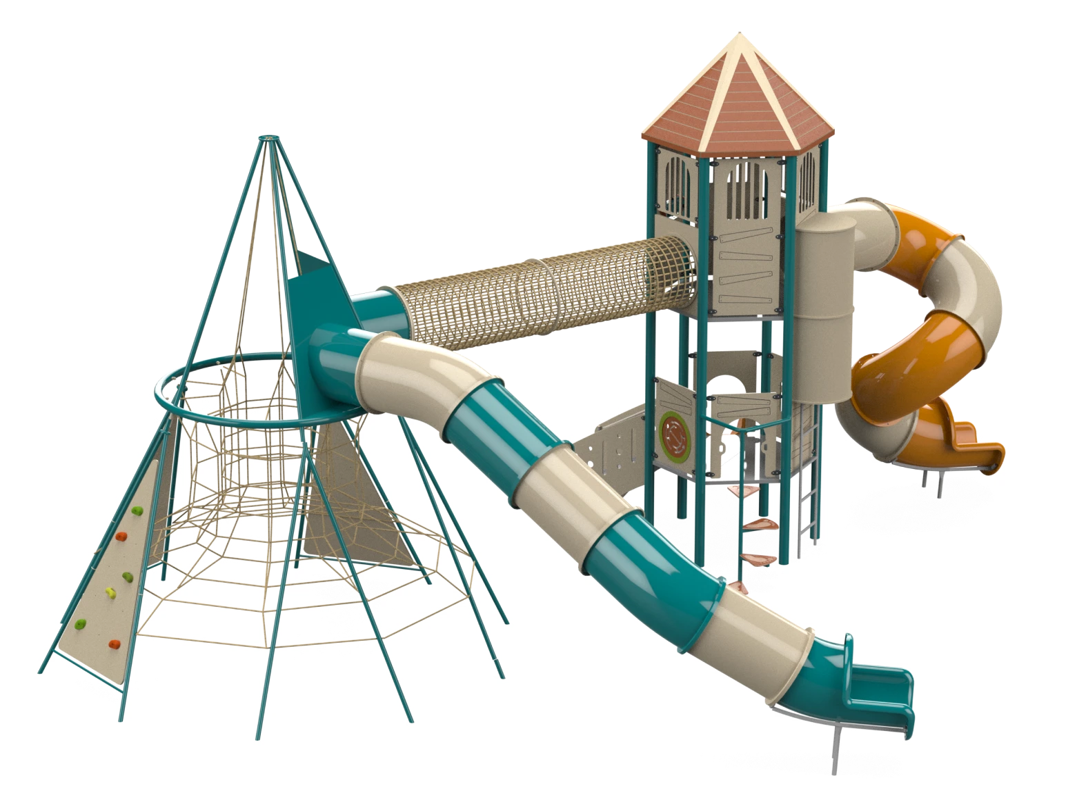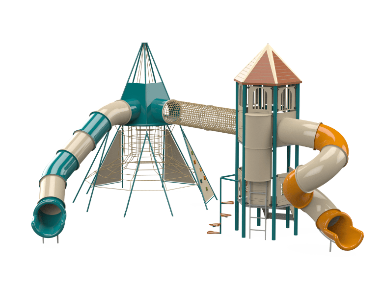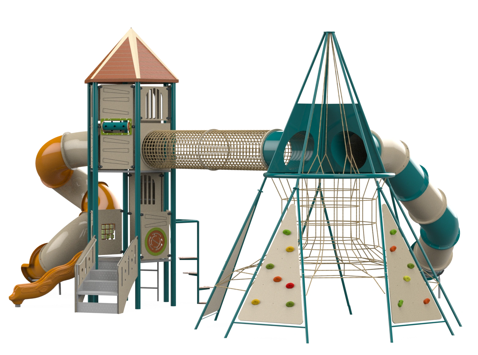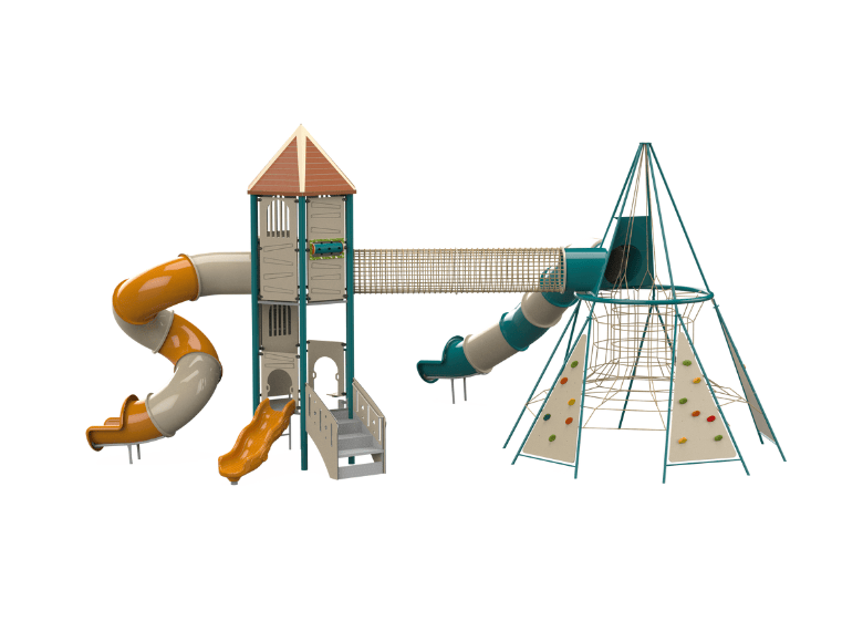 The heart of the playground is a central play system that combines multiple climbing, play, and sliding elements and can accomodate a large number of players simultaneously. The Minneapolis C is an extreme play system that is comprised of 2 towers connected by a ropes bridge. The first tower is a 5 meters high pyramid-shaped climbing structure with 3 HDPE climbing walls with hand and foot holds. A 7-meter long tube slide extends from the peak of the structure, while numerous climbing and gripping cables are attached to its center, creating challenging climbing routes. The second tower is exagonal tower consisting of two floors, climbing ladders, play panels, a toddler slide, and a curved tube slide. Suitable for imagination development games, physical development, and social interaction development. Encourages curiosity and exploration, independence, spatial orientation, stage planning, and proper organization.