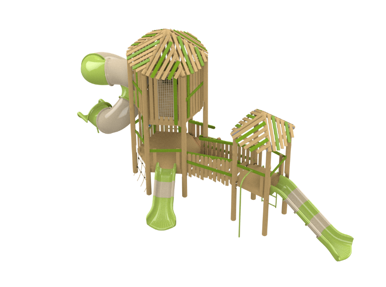 The Prago equipment combines natural European Robinia Wood with galvanized and painted steel elements, offering high durability and a visually appealing design that harmonizes well with the environment. The system includes a two-story hexagonal tower and a single-story square tower, connected by an inclined bridge. Various slides add to the challenge of the play, and the climbing elements and accessible stairs intrigue and develop children’s motor skills.