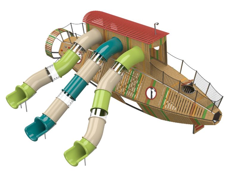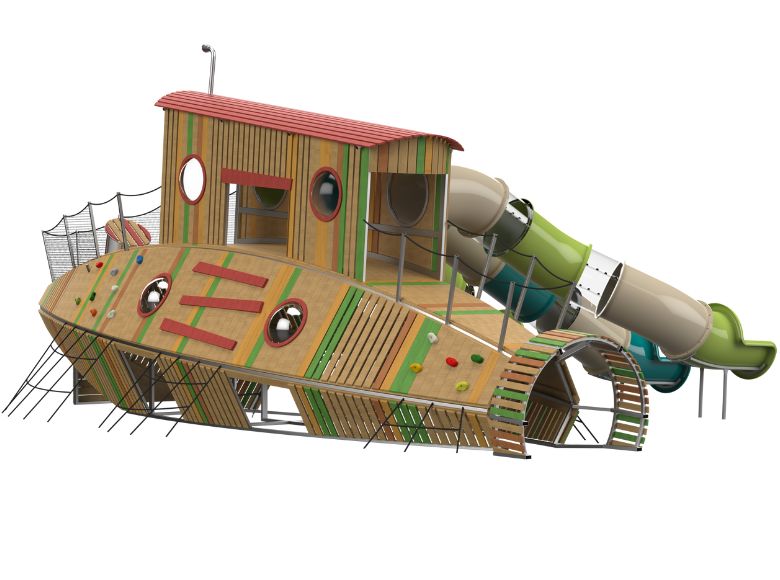 The Submarine equipment is made from Robinia Wood and stainless steel. The submarine includes two large levels. The lower level allows entry and exit through the bow and propeller via crawl tunnels, rope climbing nets, and a large bird’s nest seat. Children can climb and crawl on the propeller, on Robinia Wood beams and rubber surfaces. The upper deck serves as a large play area with handrails for safety, a telescope, and three barrel slides at different angles.
