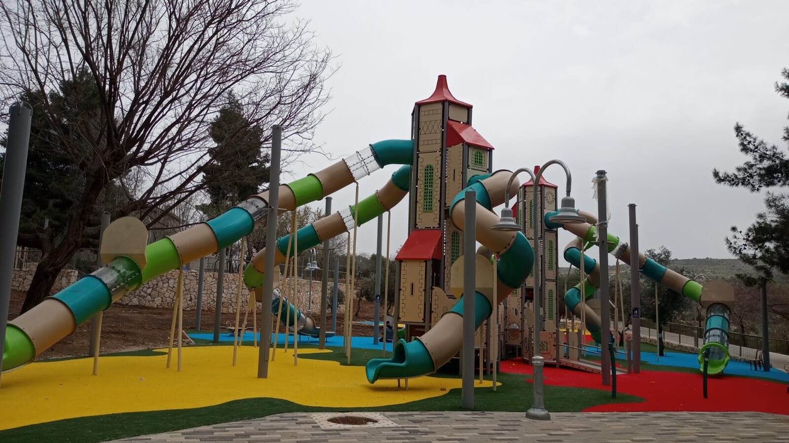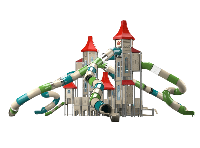 The Tallahassee play system is a spectacular playground equipment that combines the design of a magical castle with a multi-level maze. The structure rises to an impressive height and includes towers with several levels connected by hanging bridges, winding slides, and challenging climbing walls. Children can discover many internal levels, each offering new experiences and surprising routes, reminiscent of an adventure in a secret castle. The structure invites children to embark on a real exploration journey as they pass through narrow passages, climb to the peaks of the towers, and use peepholes to observe the environment from different angles. The combination of the structure’s height, many levels, and maze-like design makes Tallahassee a perfect structure for children seeking both physical and mental challenges, enjoying an imaginative adventure game.