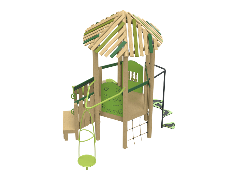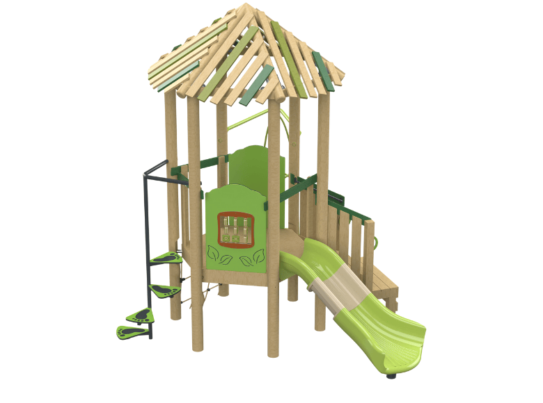 The Tinto model is a combined play system made from Robinia Wood, featuring a single tower with accessible stairs, a graduated climbing element, a spinning element, a play panel, and a slide. The system is especially suited for younger children, offering them a challenging and enjoyable play experience. The natural design of Robinia Wood blends perfectly into natural surroundings, providing children with a sense of adventure while developing motor skills, balance, and coordination.