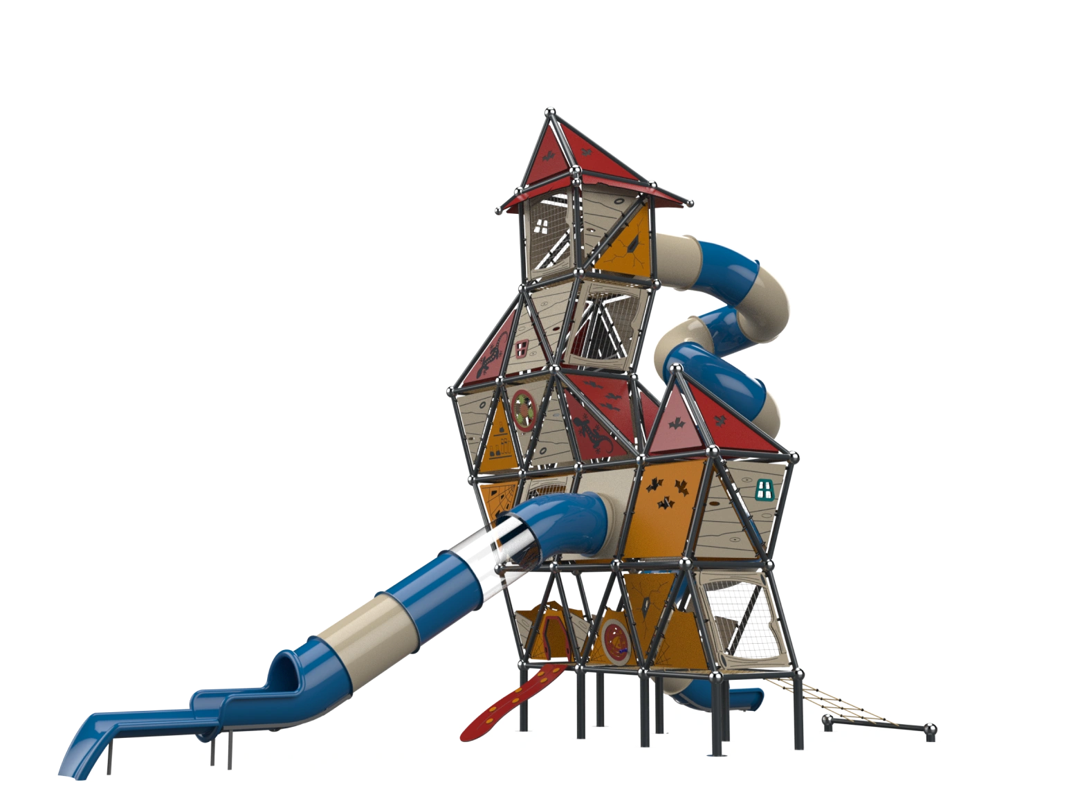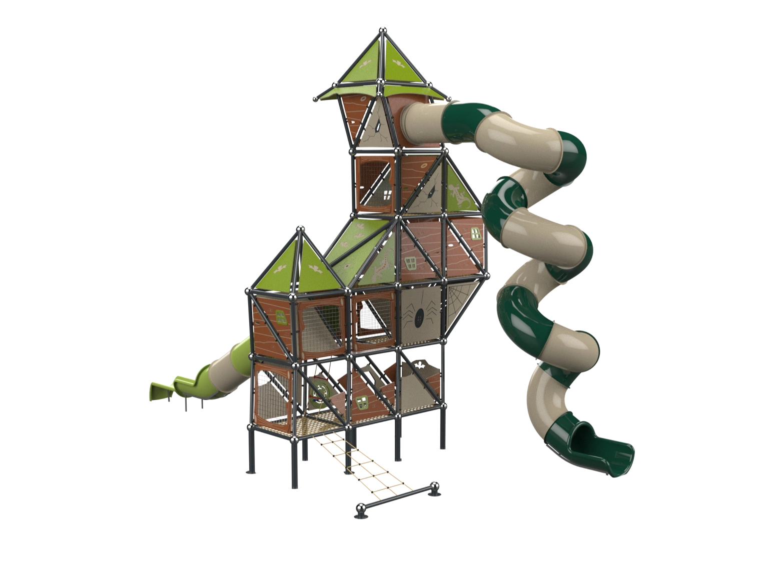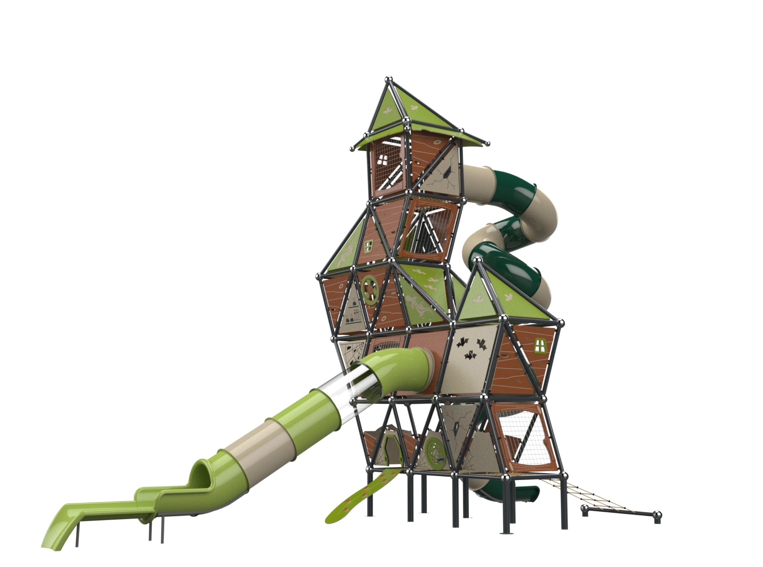 The Whitch House is a sloppy style play structure that breaks conventions, with a disheveled appearance, seemingly crooked and broken, and with elements from fairytales. The top of the strucuture rises to a height of 9.15 meters. Users can climb the structure using a cable net or climbing wall and descend via a corked tube slides. The interior of the structure consists of broken half-floors challenging players to find their way to progress in the space. The half-floors are built in different shapes, adding challenge and interest.