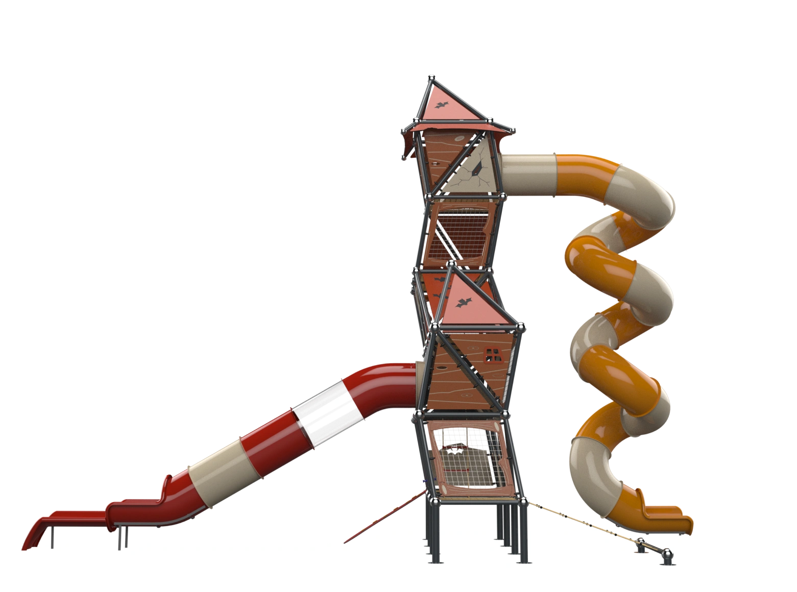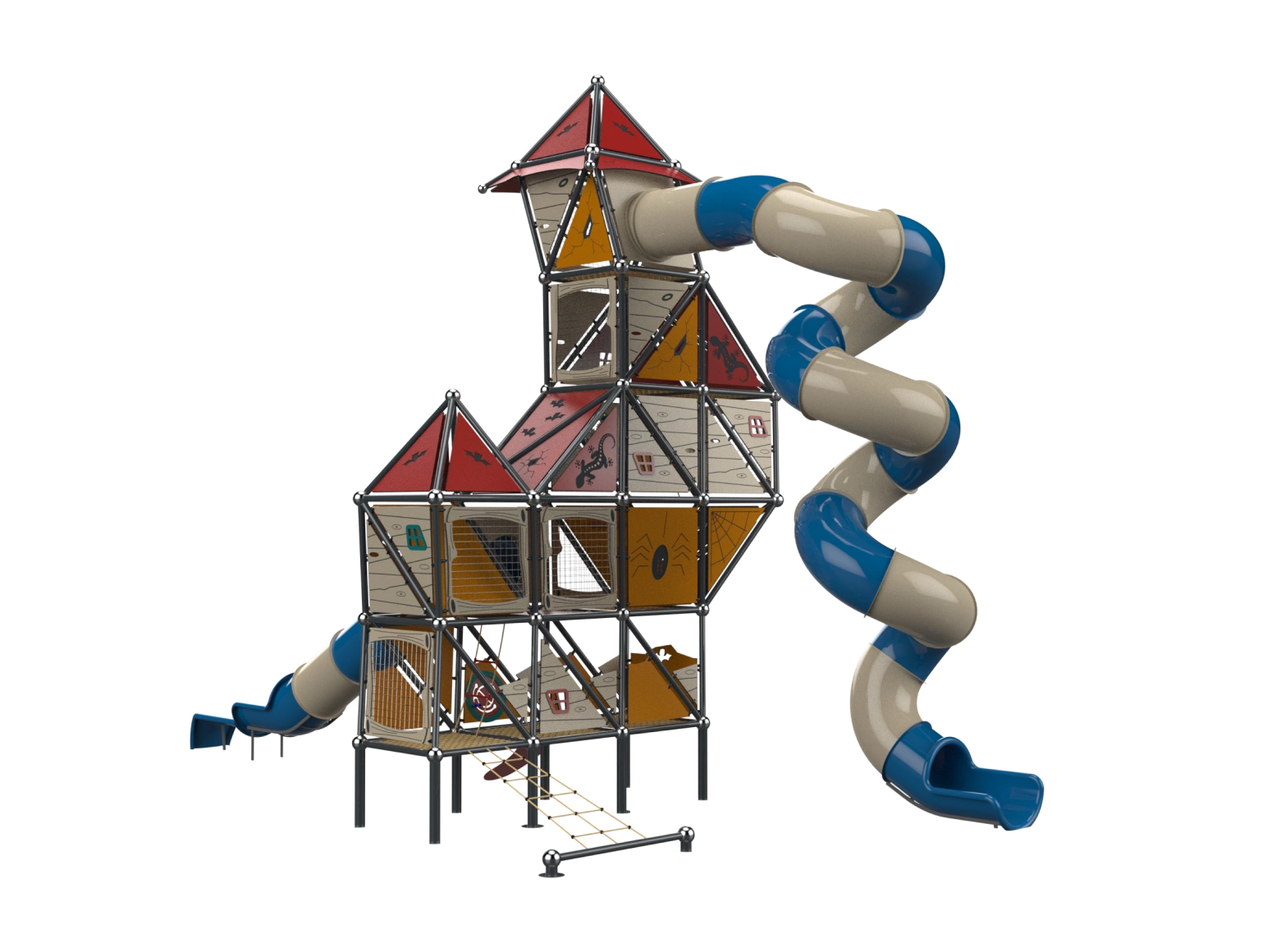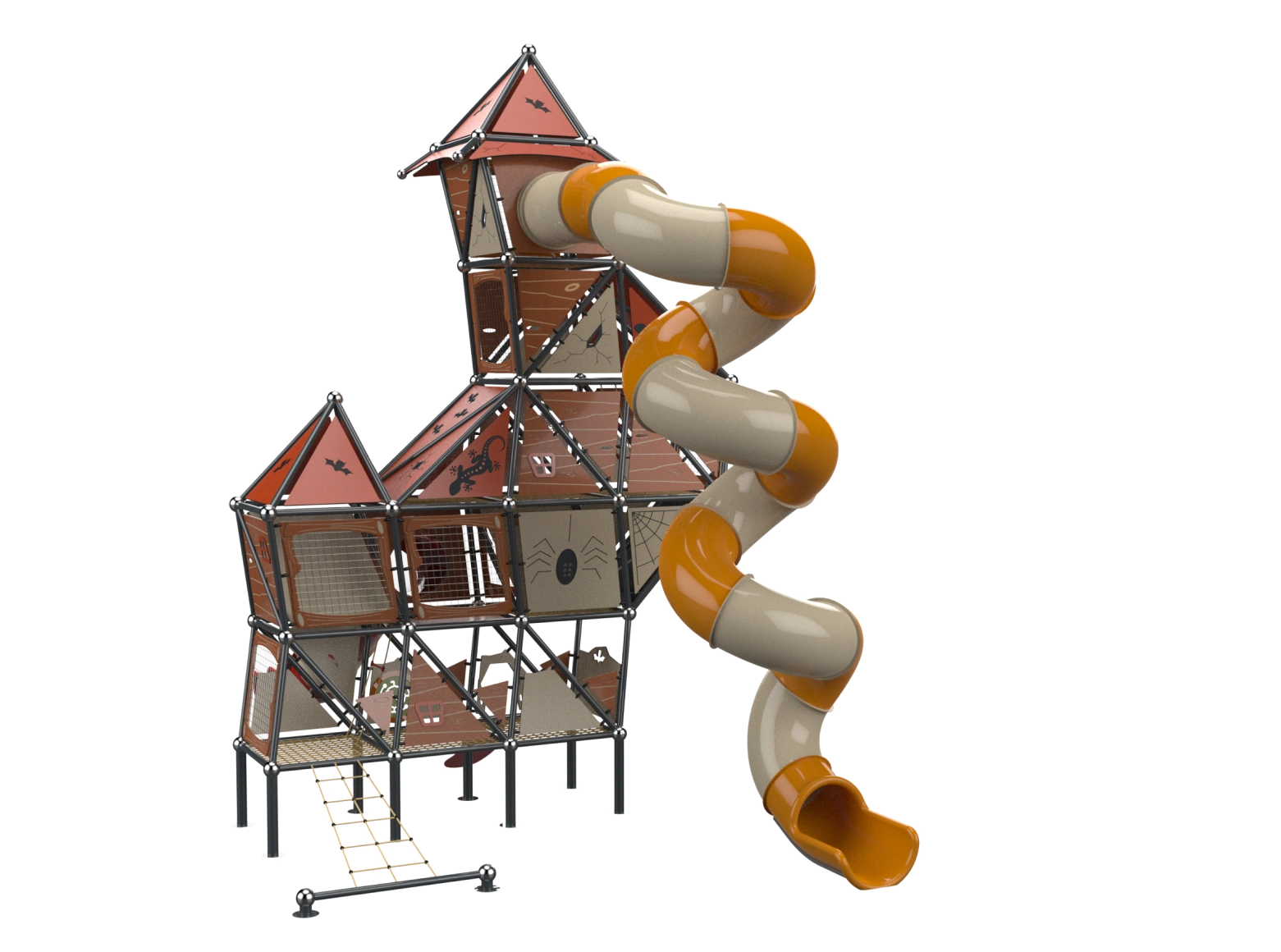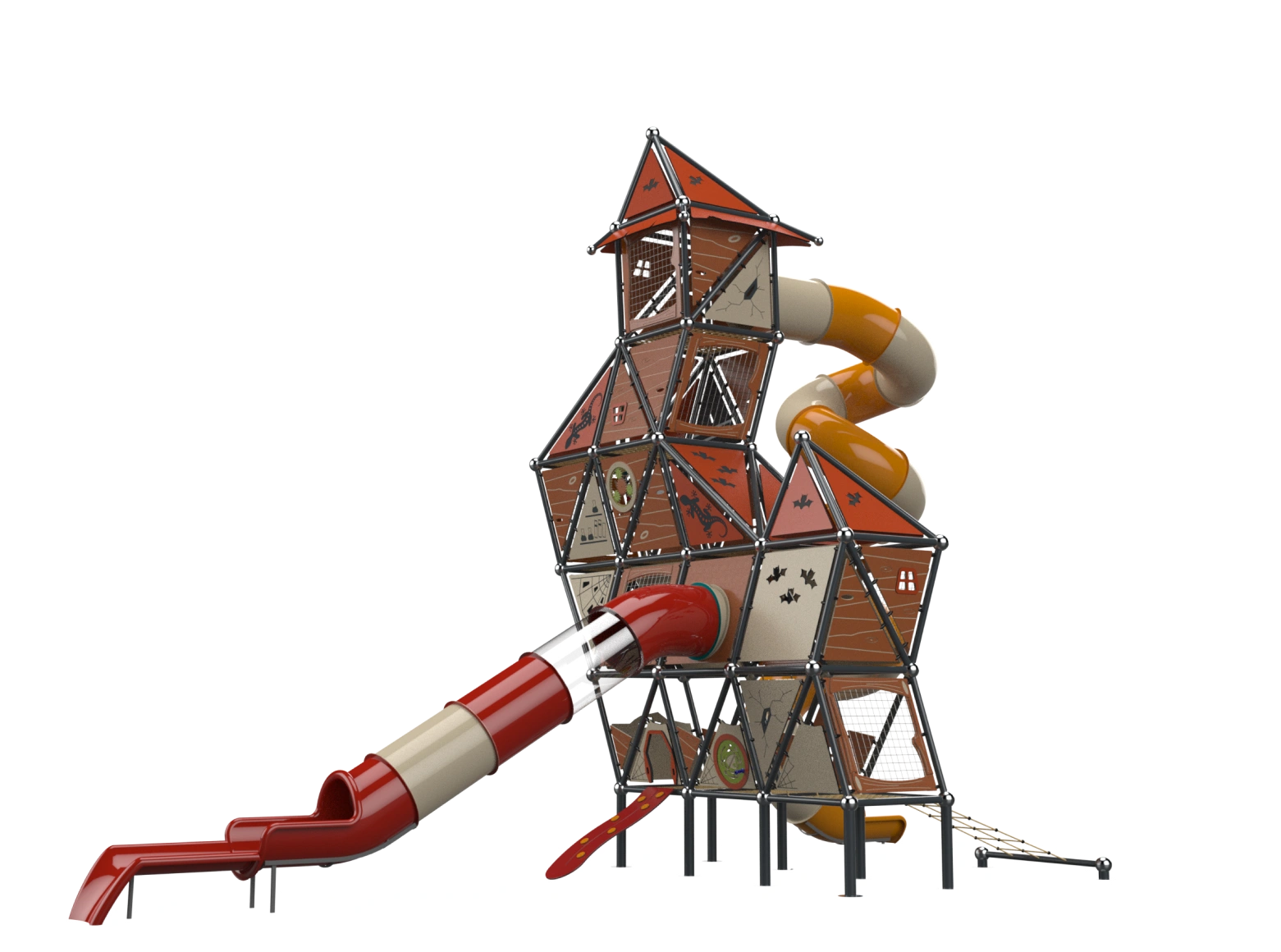 The Whitch House is a sloppy style play structure that breaks conventions, with a disheveled appearance, seemingly crooked and broken, and with elements from fairytales. The top of the strucuture rises to a height of 9.15 meters. Users can climb the structure using a cable net or climbing wall and descend via a corked tube slides. The interior of the structure consists of broken half-floors challenging players to find their way to progress in the space. The half-floors are built in different shapes, adding challenge and interest.